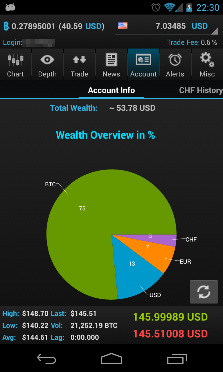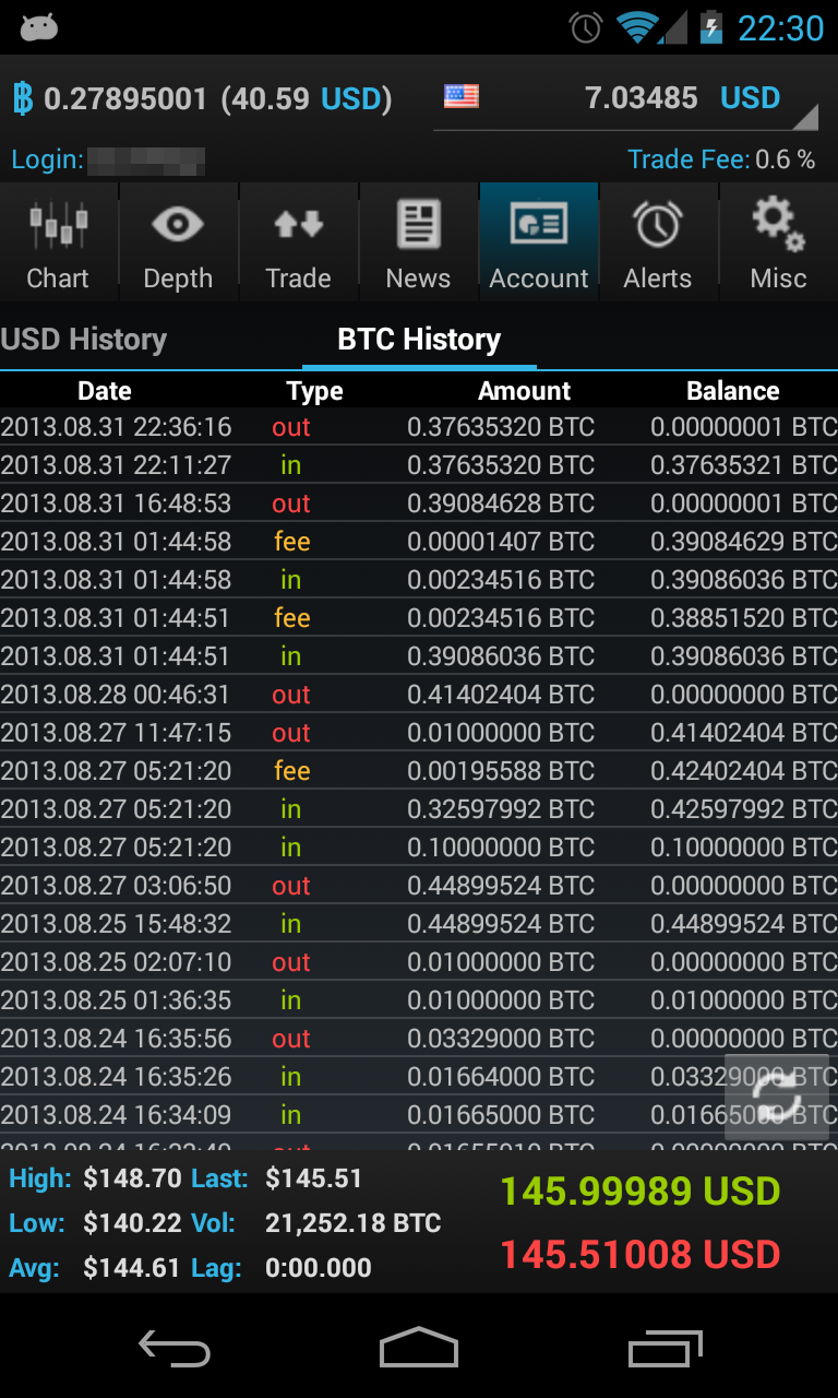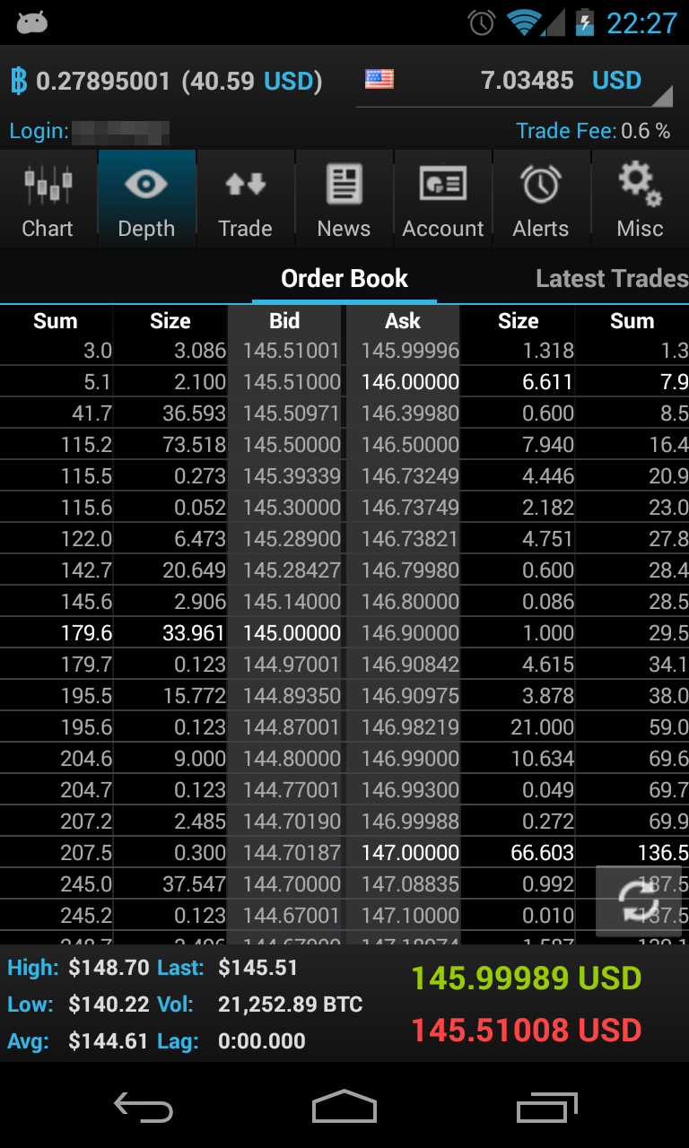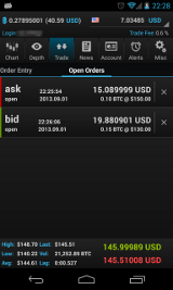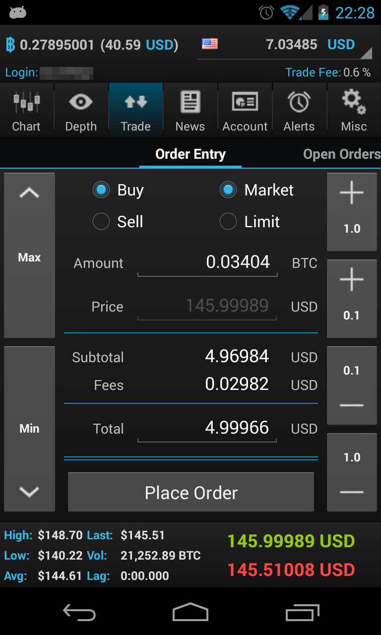 Your bitcoin balance and account balance is always displayed in the header line. The footer line displays real-time bid/ask quotes, 24h stats like volume, high and low.
