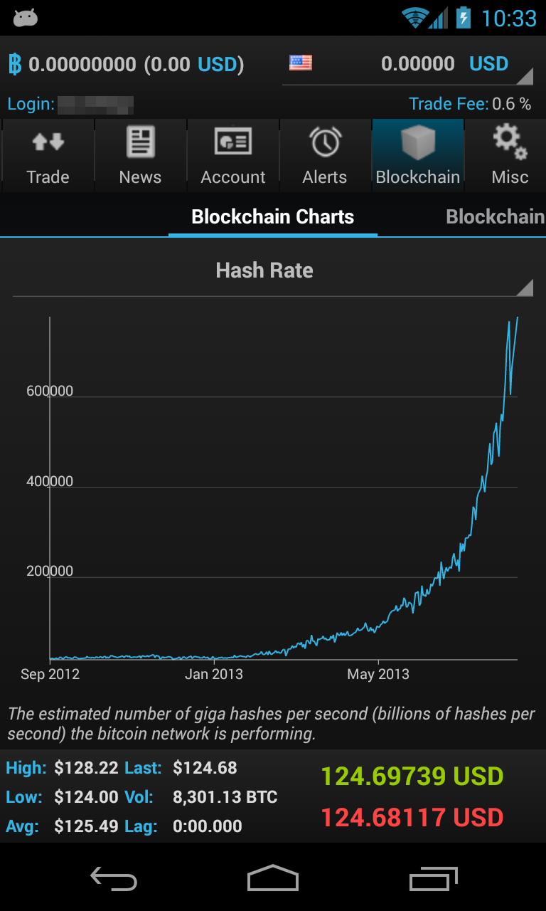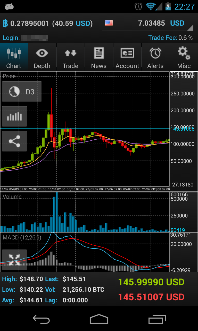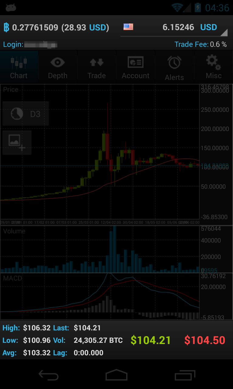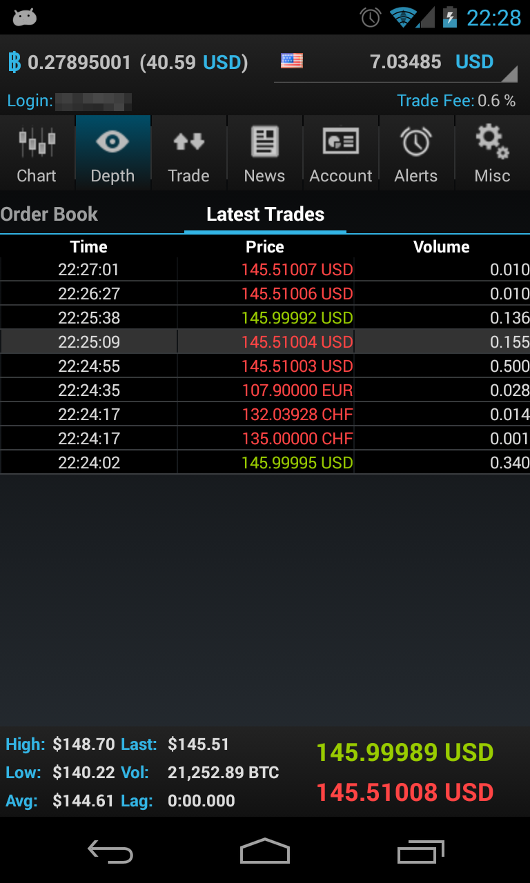 Your bitcoin balance and account balance is always displayed in the header line. The footer line displays real-time bid/ask quotes, 24h stats like volume, high and low.