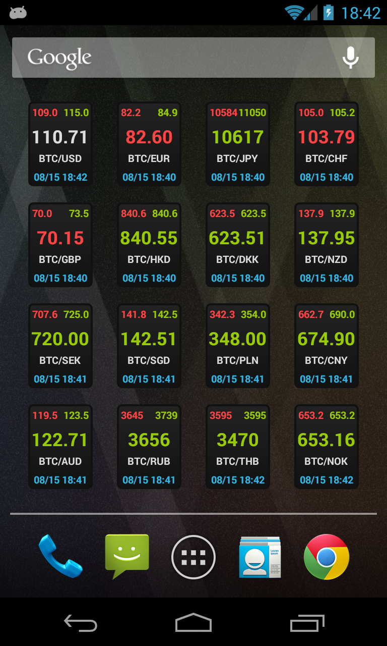 The BTCfx widget shows 24h high, low and latest quote for any of the 18 currencies directly on your home screen. The auto update inverval is 30 minutes. The widget can be used without subscription (for free).